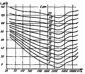 Каждая кривая соответствует одинаковой громкости, но разной интенсивности для разных частот. По отдельной кривой равной громкости можно найти интенсивности, которые при определенных частотах вызывают ощущение этой громкости.