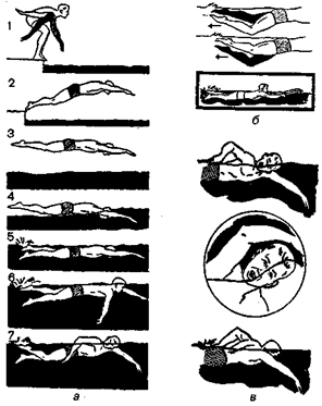зону выполнения гребка. Движения ногами при плавании на спине (б) — нога движется вверх в согнутом положении, вниз — выпрямленная. Ноги выполняют движения несколько глубже, чем при плавании кролем на груди. Вид спереди и сзади (в) — верхний рисунок показывает гребок левой рукой и пронос правой. Средний и нижний рисунки показывают согнутое положение руки в гребке; рука проводится близко к поверхности воды. Старт (д): 1 — наиболее распространенные исходные положения на старте: а) стопа одной ноги стоит выше другой; б) обе стопы находятся на одном уровне. Первое положение более удобно и надежно. 2. Оттапкивание от стенки с активным движением головой. Руки выполняют мах через стороны или над головой. 3. В конце полета тело почти прямое, голова отклонена назад. 4. Голова слегка поднимается для регулирования глубины скольжения. 5. Ноги начинают движения, после чего включаются руки. Обычный скоростной поворот на спине (г): 1 — Правая рука касается стенки. 2. Голова опускается вниз; ноги сгибаются для повышения скорости поворота; правая рука касается стенки на глубине 50—60 см; левая поддерживает равновесие. 3. Пловец проносит ноги по воздуху к стенке. 4. Пловец готов к отталкиванию. 5. Спортсмен отталкивается, слегка направляя тело к поверхности воды