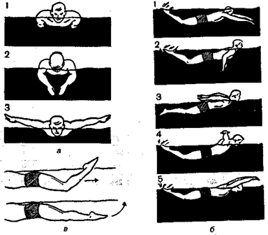 1. Положение головы перед проносом рук. 2. Гребок согнутыми руками, подобно тому, как он выполняется в кроле. 3. Положение рук после гребка в начале проноса. Вид сбоку (б): 1. Руки погружены в воду и готовы начать гребок.