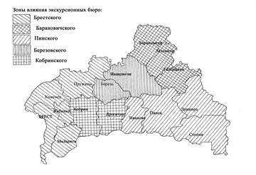 В связи с необходимостью вовлечения в туристское обслуживание большего количества населения на территории Брестской области стали создаваться бюро путешествий и экскурсий в других городах: Барановичи – 1969 г., Пинск – 1970 г., Береза – 1976 г., Кобрин – 1981 г. (рисунок 6). По разнообразию выполняемых функций все бюро путешествий и экскурсий практически не отличались между собой. Экскурсионные бюро с целью вовлечения в туристское обслуживание большего количества населения территорию Брестской области разделили на потребительские районы (границы потребительских районов совпадали с границами административно-территориальных районов Брестской области).