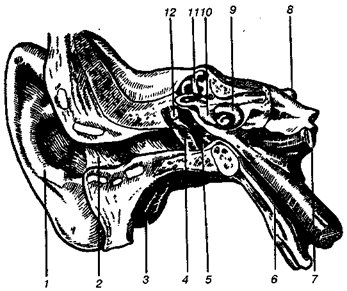1 — ушная раковина; 2 — наружный слуховой проход; 3 — сосцевидный отросток височной кости; 4 — барабанная перепонка; 5 — барабанная полость; 6 — слуховая труба; 7 — внутренняя сонная артерия; 8 — преддверно-улитковый нерв; 9 — лабиринт внутреннего уха; 10 —преддверие; 11 — полукружные протоки; 12 —слуховые косточки