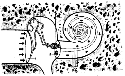 Рис. 17.55.Схема распространения звуковой волны (показано стрелками) в наружном, среднем и внутреннем ухе: 1 — барабанная перепонка, 2— молоточек, 3 — наковальня, 4 — стремя, 5 — круглое окно, 6 — барабанная лестница, 7—улитковый проток, 8 — лестница преддверия