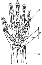 1 — артроз в запястно-пястном суставе (бокс), 2 — тендиноз в месте прикрепления; гороховидная кость — прыжки в воду, шиловидный отросток локтевой кости — прыжки в воду, фехтование, III пястная кость (дорсальное основание) — бокс; 3 — перитендиноз (волейбол, теннис, настольный теннис)