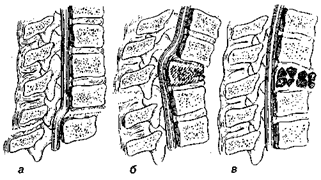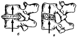При нагружении диска разрушается его гиалиновая пластинка (см. рис. 18.25), а с ростом нагрузки происходит разрыв фиброзного кольца.