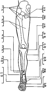 1 — таз; 2 — отрывные переломы (спринт, спортивные игры); 3 — мышцы бедра; 4 — мышечные грыжи, разрывы мышц (частичные) — спринт, спортивные игры; 5 — разрыв ахиллова сухожилия (полный, неполный); б—бег, спортивные игры (быстрое наступление), гимнастика (соскок со снаряда); 7 — торсионный перелом средней трети большеберцовой кости; 8 — футбол; 9 — поперечный перелом большеберцовой кости по краю обуви; 10 — скоростной спуск на лыжах; 11 — повреждения связок в верхнем отделе голеностопного сустава (чаще всего передней тараннома-лоберцовой связки); 12 — бег, прыжки, все виды игры с мячом, гимнастика, лыжные гонки; 13— гребень лобковой кости, бугорок лобковой кости; 14 — футбол, бег; 75 — ветвь седалищной кости; 16 — футбол, бег; 17 — бугристость большеберцовой кости; 18 — футбол, прыжки; 19 — периостоз краевых поверхностей большеберцовой кости; 20 — бег, прыжки, ходьба; 21 — ахиллодиния (паратендинит ахиллова сухожилия); 22 — бег, прыжки, гимнастика; 23 — хроническое растяжение в верхнем отделе голеностопного сустава; 24 — бег, прыжки, все виды игр с мячом, гимнастика, лыжные гонки; 25 — артроз предплюсны; 26 — футбол, прыжки; 27 — стрессовый перелом плюсны (маршевый перелом); 28 — футбол, прыжки, бег, ходьба (К. Франке, 1981)