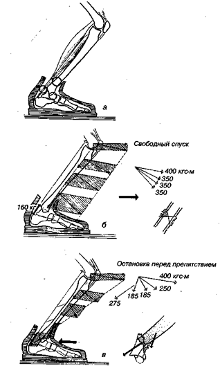 а — современная лыжная обувь, фиксирующая голеностопный сустав, вызывает три вида травм: в области верхнего края ботинка, компрессию переднего края большеберцовой кости, разрыв ахиллова сухожилия; б, в — направление нагрузки при свободном спуске и столкновении с препятствием