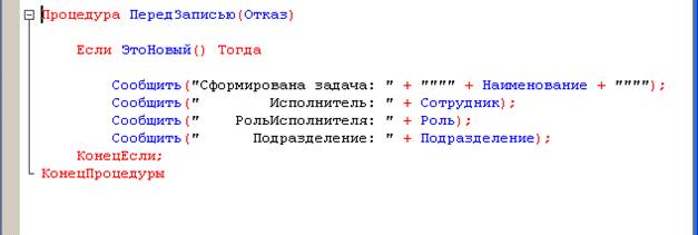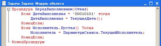 Для заполнения ряда реквизитов задачи в модуле объекта «Задача» определим обработчик события «ПередВыполнением()», который определяет, что при выполнении задачи (программном или интерактивном) в ней сохраняется время выполнения и исполнитель.