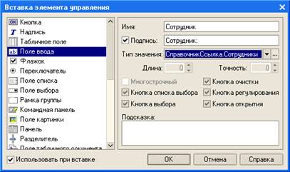 Создадим реквизит формы списка «Сотрудник» типа «СправочникСсылка.Сотрудники», для этого зайдем на вкладку «Реквизиты» формы списка. Определим в диалоге элемент управления «Поле ввода» («Форма – Вставить элемент управления») и свяжем его через свойство «Данные» с реквизитом формы «Сотрудник».
