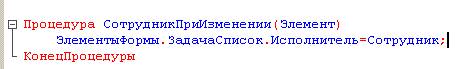 В этой процедуре при изменении значения в элементе управления, связанном с реквизитом формы «Сотрудник» новое значение записывается в свойство расширения табличного поля. Это приводит к тому, что в списке отображаются задачи только по выбранному исполнителю.