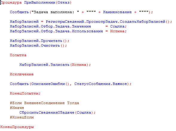 Если модуль используется при внешнем соединении (через СОМ - коннектор), то модуль приложения не компилируется, и поэтому обращение к процедуре «СброситьСведенияОЗадаче()» приведет к ошибке. Определять данную процедуру в общем модуле с видимостью ее во внешнем соединении смысла не имеет, т.к. она участвует в реализации интерфейсного механизма работы пользователя. Сам вызов этой процедуры в этих обработчиках событий обусловлен тем, что как при выполнении, так и при интерактивной активации, статус задачи меняется.