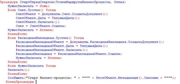 При запуске (старте) бизнес - процесса необходимо выполнить процедуру, в которой производится проверка на заполнение реквизитов «Счет» и «РасходнаяНакладная». Если реквизиты содержат пустые ссылки (это возможно, если бизнес – процесс вводится на основании, либо пользователь перед стартом в форме бизнес – процесса мог выбрать нужные документы), то тогда создаются документы соответствующих видов, и ссылки на них записываются в бизнес – процесс. Для ввода текста процедуры надо выбрать пункт «Свойства» из контекстного меню блока старта бизнес – процесса, а в палитре свойств найти соответствующее событие.