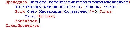 Результатом будет открытие формы расходной накладной и счета, а форма счета при этом открыта не будет, т.к. отключен флаг «СтандартнаяОбработка». При попытке выполнения задачи точки маршрута «ВыпискаСчета» сработает следующий обработчик события «ПередИнтерактивнымВыполнением».