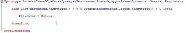 После его выполнения открывается форма счета, а форма задачи не открывается. После выполнения текущей задачи бизнес – процесс переходит к точке условия «Счет утвержден?». Ее обработчик проверки условия имеет следующий вид: