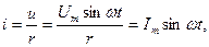 Синусоиды тока и напряжения имеют одинаковую частоту и совпадают по фазе. Для действующих значений напряжений тока в этом случае, мы можем написать следующее выражение закона Ома: