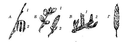 | Рисунок 17 – Цветение растений (1–женские цветы, 2–мужские): А – орешник; Б – ива козья; В – ель; Г – лисохвост |