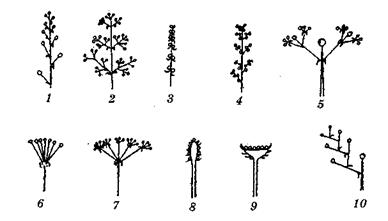 | Рисунок 18 – Схемы соцветий (последовательность зацветания показана кружками различной величины, начиная с больших): 1 – кисть; 2 – метелка; 3 – колос; 4 – сложный колос; 5 – развилина; 6 – зонтик; 7 – сложный зонтик; 8 – головка; 9 – корзинка; 10 – завиток |