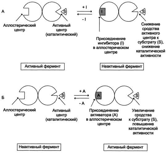 Схема работы аллостерического фермента. А - действие отрицательного эффектора (ингибитора); Б - действие положительного эффектора (активатора).