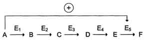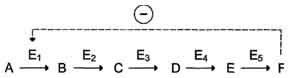 · Фермент, катализирующий превращение субстрата А в продукт В, имеет аллостерический центр для отрицательного эффектора, которым служит конечный продукт метаболического пути F. Если концентрация F увеличивается (т.е. вещество F синтезируется быстрее, чем расходуется), ингибируется активность одного из начальных ферментов. Такую регуляцию называют отрицательной обратной связью, или ретро-ингибированием. Отрицательная обратная связь - часто встречающийся механизм регуляции метаболизма в клетке.