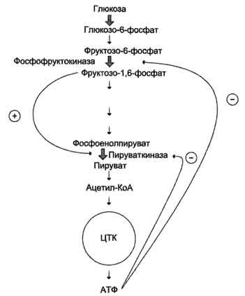Схема положительной и отрицательной регуляции катаболизма глюкозы. Молекула АТФ участвует в ингибировании (ретроингибировании) аллостерических ферментов фосфофруктокиназы и пируваткиназы. Фруктоза-1,6-бисфосфат - активатор метаболического пути распада глюкозы. Плюсами отмечена активация, минусами - ингибирование ферментов.