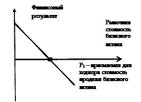 | Шаг 2.Финансовый результат от продажи фьючерсного контракта в зависимости от рыночной стоимости базисного актива. Участник срочного рынка продал фьючерсный контракт по цене P1. Если на рынке стоимость базисного актива будет выше, продавец фьючерсного контракта все равно будет вынужден продать базисный актив по цене P1 , т. е. он будет нести убытки. Однако если рыночная стоимость базисного актива станет ниже P1, возникает финансовый выигрыш |
