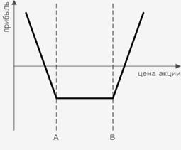 | Покупка стрэнгла. Long Strangle. Суть стратегии в единовременном приобретении опционов coll и put с разной ценой исполнения, но с единой датой окончания контрактов. При это цена исполнения Coll-опциона (В) должна быть выше цены исполнения Put-опциона (А). Применение такой стратеги актуально в тех же случаях, что и применение Straddle, однако в данном случае из-за увеличения зоны неэффективности реализации опционов, премия уплачиваемая за их приобретение будет ниже. Преимущества обоих представленных стратегий – в «неограниченности» прибыли в условиях высокой волатильности базисного актива В случаях когда ожидается низковолатильный тренд базисного актива или всего рынка рекомендуется использовать короткую позицию по таким инструментам с целью получения дохода в размере премии от продаваемых опционов. |