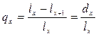 | qx - вероятность наступления смерти в возрасте х лет, не дожив до возраста (х + 1) год; dx — число умерших при переходе от возраста х к возрасту (х+1) | |
