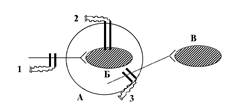 А – нерв; Б – нервно-мышечный синапс; В – мышца; 1 и 2 – раздражающие электроды; 3 и 4 – осциллографы. При раздражении 1 измеряют лабильность нерва и синапса; при раздражении 2 – мышцы.