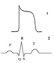 1 – потенциал действия рабочего кардиомиоцита желудочка, 2 – ЭКГ во II стандартном отведении.