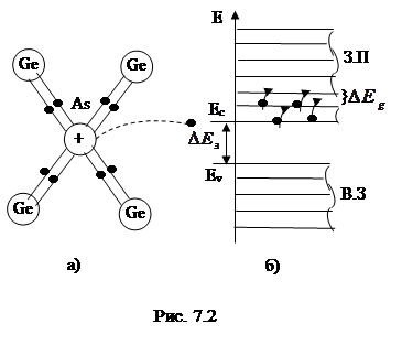Расчет показывает, что ∆Еg имеет порядок ≈0,01 эВ. Энергии тепловых колебаний решетки при комнатных температурах достаточно для отрыва “лишнего“ электрона от атома германия и превращения его в свободный электрон. В узле решетки при этом возникает положительно заряженный ион (рис. 7.2,а). При температуре Т ≈ 300 К практически все атомы мышьяка ионизуются, то есть в германии появляются электроны проводимости с концентрацией n, практически равной концентрации примесей (этот процесс показан на рис. 7.2а, стрелками). Описанный механизм обеспечивает электронную проводимость(n – типа) в примесном полупроводнике. Атомы примесей, валентность которых на единицу больше валентности основных атомов полупроводника, называются донорами. Донорными примесями для Ge и Si являются элементы V группы: Р, Аs, Sв.