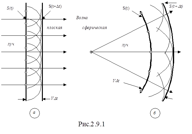 В однородной изотропной среде фронты вторичных волн в момент времени t+Dt представляют собой сферы радиуса VDt, центры которых лежат на поверхности S(t) (рис. 2.9.1, а, б).