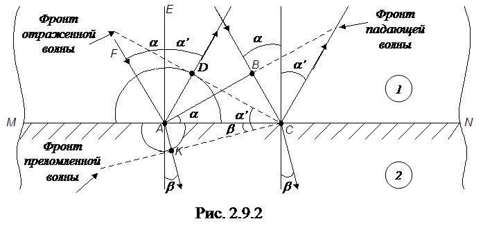 Угол a между направлением распространения FA и перпендикуляром AE к границе MN называется углом падения. Фронт падающей волны AB в некоторый момент достигнет границу раздела MN в точке A, которая станет источником вторичной волны. За время Dt падающая волна достигнет точки С, а фронт вторичной волны достигнет точек полусферы, радиус которой равен AD = V1Dt =BC.