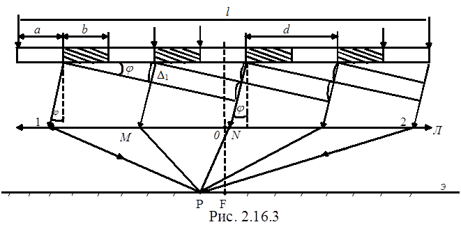 Система многих параллельных щелей, разделенных непрозрачными промежутками, называется дифракционной решеткой. На принципе дифракционной решетки построены многие антенны, состоящие из нескольких параллельных когерентных излучателей. Каждый излучатель играет роль одной щели.Пусть плоская световая волна падает на дифракционную решетку из N параллельных щелей шириной b каждая, расположенных на расстояниях b друг от друга (рис. 2.16.3).