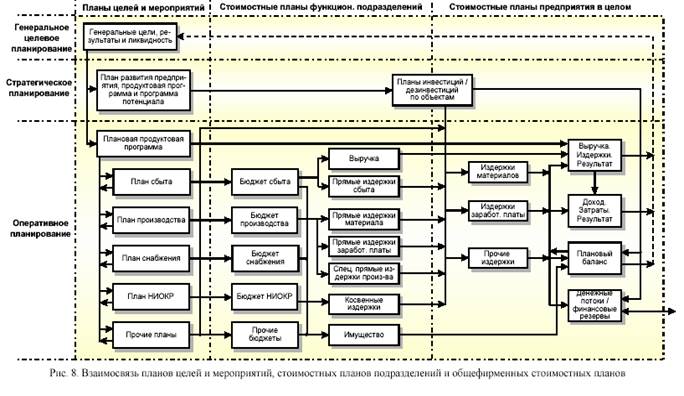 На рис. 8 представленная принципиальную схему интегрированного процесса координации планов, а также схематично представлена взаимосвязь между планами целей и мероприятий, стоимостными планами подразделений и общефирменными стоимостными планами.