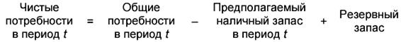Определение чистых материальных потребностей (неттинг – netting) выполняется путем вычитания из величины общей потребности суммы наличных запасов и запланированных поставок по графику, а затем к полученному результату прибавляются требования по резервному запасу, если они необходимы: