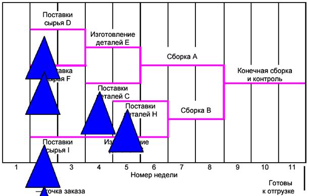 Временная синхронизация производственных потребностей отчетливо видна на диаграмме сроков сборочного процесса (рис. 6.15) Например, сырьевые материалы D,F,I должны быть заказаны в начале второй недели, деталь С – в начале четвертой недели., а деталь H – в начале пятой недели, чтобы обеспечить производство в соответствии с планом.