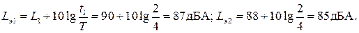 Пример 2. Найти эквивалентный УЗ, если Т = 4 ч, L1 = 90 дБА, t1 = 2 ч, L2 = 88 дВА, t2= 2 ч.