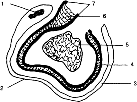 Рис. 1 Разрез нерва 1 — ядро, 2 — клетка Шванна, 3 — миелин, 4 — нервная мембрана, 5 — аксоплазма, 6 — липидный слой, 7 — протеиновая оболочка