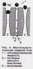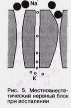 Вследствие развития воспалительного процесса в тканях, через которые вводится местный анесте-тик, возникает блокада натриевого канала на внешней поверхности мембраны (рис. 5). Такой же эффект можно наблюдать при токсическом воздействии на рецепторы мембраны.