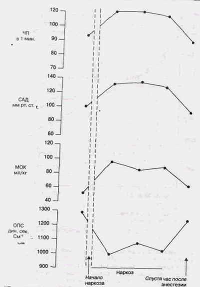 У больных с острыми воспалительными процессами в челюстно-лицевой области введение кетамина сопровождалось повышением среднего АД на 25 %, увеличением частоты сердечных сокращений на 20 % и одновременного возрастания минутного объема кровообращения (рис. 17). Обычно к концу операции наблюдалось снижение минутного объема кровообращения до исходного уровня.