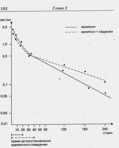 Исследование фармакокинетики калипсола позволяет считать, что она укладывается в рамки двухкамерной модельной системы. В течение 1 ч. концентрация препарата в крови изменялась с 1,5 до 0,3 мкгс/мл при Т 1/2 = 6,8 мин., Т 1/2 =° 61,8 мин. При применении калипсола на фоне седуксена концентрация препарата снижалась с 1,2 до 0,4 мкг/мл при Т 1/2 = 6,7 мин, Т 1/2 = 145,6 мин. (рис. 18). Как видно из полученных результатов, введение калипсола на фоне седуксена приводит к удлинению В — фазы, уменьшению скорости выведения калипсола. Оказалось, что введение калипсола без седуксена приводит к анальге-тическому эффекту продолжительностью 10 ± 2,5 мин., через 14 ± 2 мин. больной начинал вступать в контакт и через 20 — 2,5 мин. полностью возвращался к исходному состоянию. Таким образом, введение седуксена увеличивает время биологической жизни калипсола и коррелирует с клиническими данными, т.е. увеличение времени анальгетического действия, времени возвращения к адекватному состоянию (Лепахин В.К. и др., 1981).
