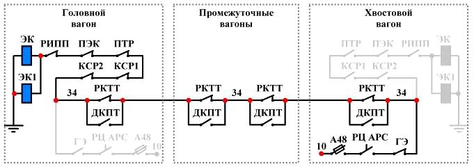 10Ппр. хвостового вагона—А48—РЦ АРС включён—контакты ГЭ (катушка обесточена)—контакты РКТТ или ДКПТ всего поезда—контакты КСР1 и КСР2 головного вагона (катушки обесточены из-за превышения скорости)—контакты ПТР (катушка под питанием)—контакты ПЭК (катушка под питанием)—контакты РИПП (катушка под питанием)—катушки реле ЭК и ЭК1—земля.