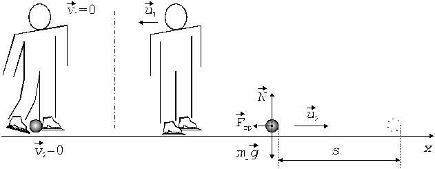 Решение. Конькобежец и камень (рис. 3) составляют замкнутую систему, для которой выполняется закон сохранения импульса