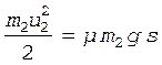 Пример 5. Конькобежец массой m1, стоя на льду, толкает в горизонтальном направлении камень массой m2 = 5 кг и откатывается назад со скоростью u1= 0,3 м/с относительно земли. Коэффициент трения камня о лед равен m =0,06; расстояние, на которое переместился камень, равно s = 15 м. Определить массу конькобежца.