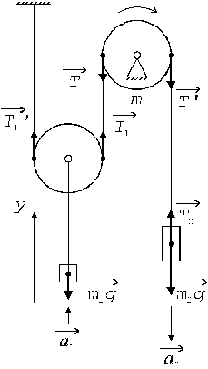 Пример 6. Нерастяжимая тонкая гибкая нить одним концом закреплена, как показано на рис.4, затем перекинута через невесомый подвижный блок и через неподвижный блок в виде сплошного диска массой m = 6 кг. К подвижному блоку подвешен груз массой m1 = 5 кг, ко второму концу нити подвешен груз массой m2 = 10 кг.