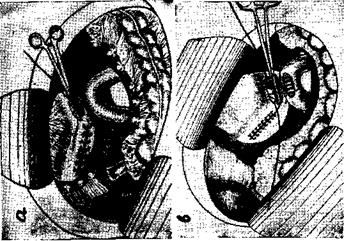4. Затем приступают к наложению непрерывного шва на переднюю стенку, используя край серозно-мышечной оболочки желудка и кишки, в два этажа. После этого раздавливают коагулянт.