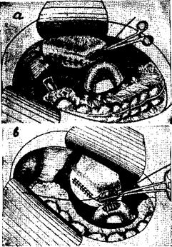 желудка наложен кровоостанавливающий зажим, а под него — страховочная лигатура. б) Наложение двухрядного серозно-мышечного шва между культей желудка я кишкой выше зажима, в) Коагулят слизистой тонкой кишки в области будущего анастомоза, г) Наложение сводящих серозно-мышечных швов на переднюю стенку желудка и кишки Кровоостанавливающий зажим снят. Страховочная лигатура натянута.