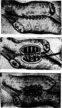 6. Наложение анастомозов при ишемической болезни кишечника должно проводиться без зажимов и с предварительной инстилляцией антибиотиков в просвет кишки (рис. 14).