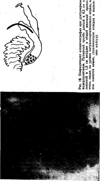 Рис.18. Операционная холангиография. Пузырный проток длиной в 8 см идет параллельно общему желчному протоку и впадает в него на уровне интрапанкреатического отдела. Такой вариант хода пузырного протока создает условия для сдавления его и нарушения оттока желчи.