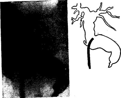 Рис. 24. Операционная холангиография. Ущемленный камень большого дуоденального соска, вызвавший полное нарушение оттока желчи, панкреатического сока в двенадцатиперстную кишку и расширение вне- и внутрипеченочных ходов. Имеется рефлюкс Контрастного вещества в высоко впадающий в холедох расширенный Вирсунгов проток.