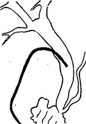 Рис 32 Операционная холангиография. Стеноз большого дуоденального соска (папиллосфинктерный игрекообразный стеноз). Резкое расишрение общего, желчного протока. Сужение на протяжении 1,2 см терминального отдела холедоха. Стриктура Вирсунгова протока на протяжении 1 см и резкое его расширение (до 1 см).